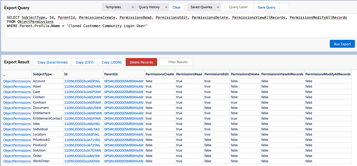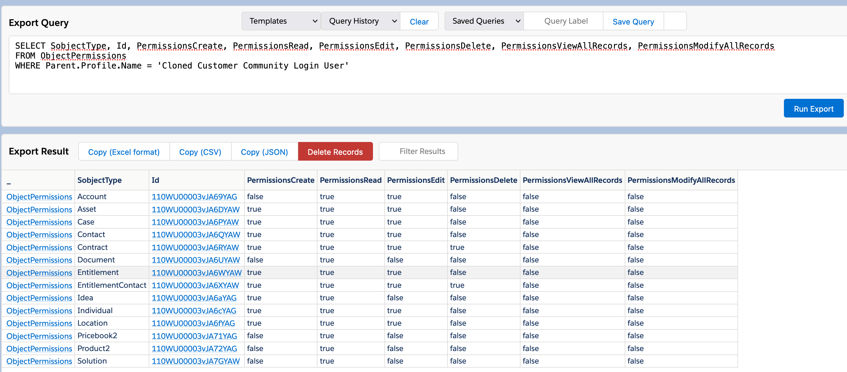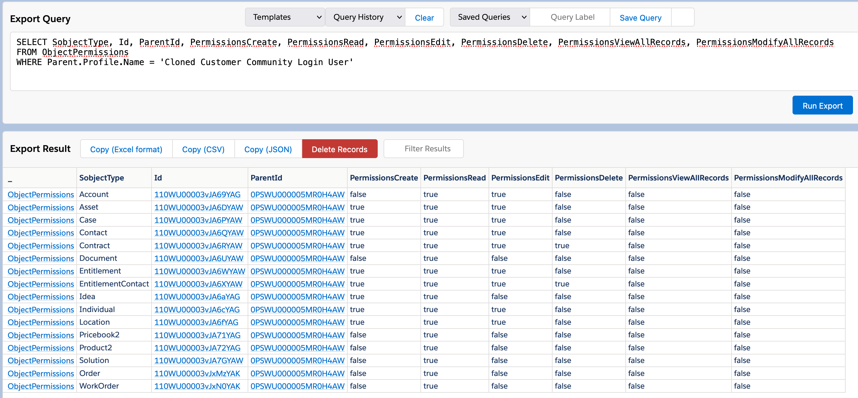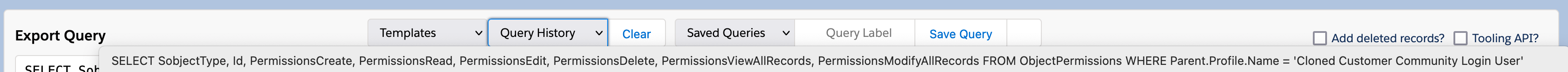 So, let's go for our newly Cloned Community profile with a query for the object permissions: