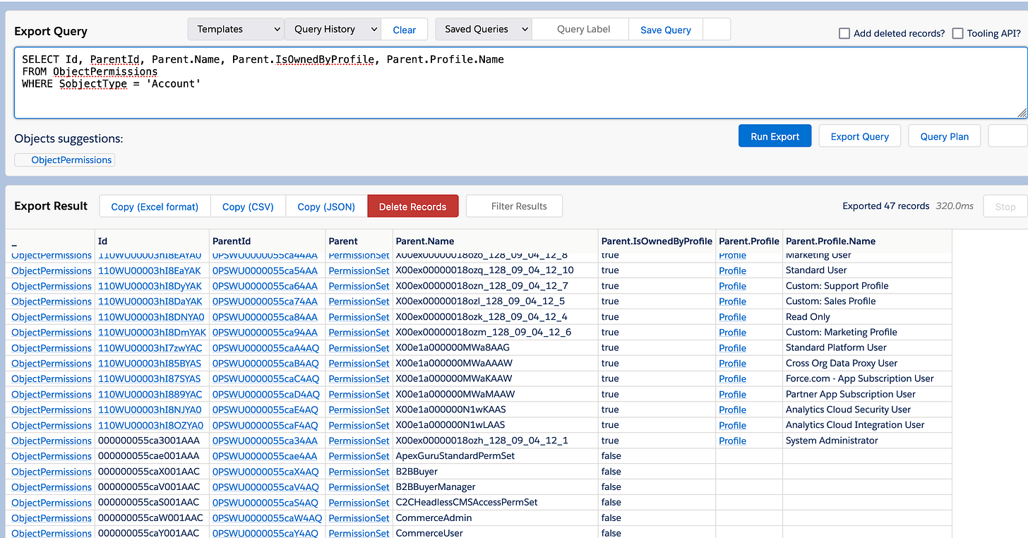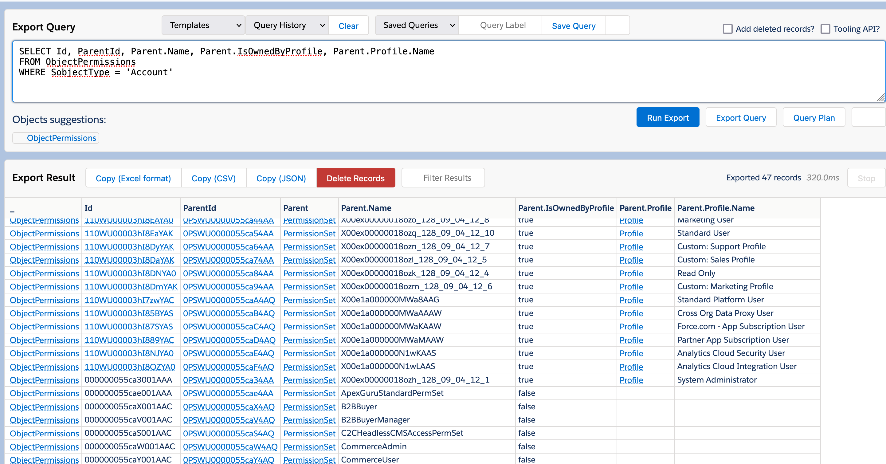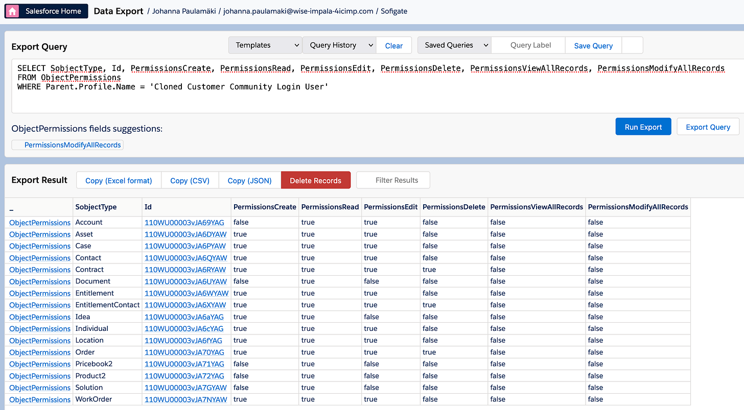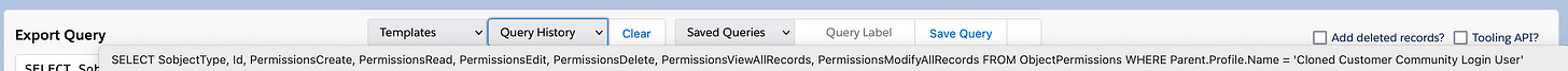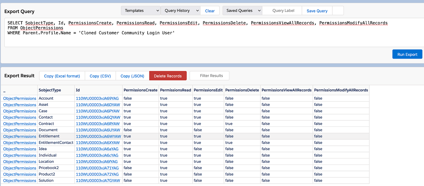 So, let's go for our newly Cloned Community profile with a query for the object permissions: