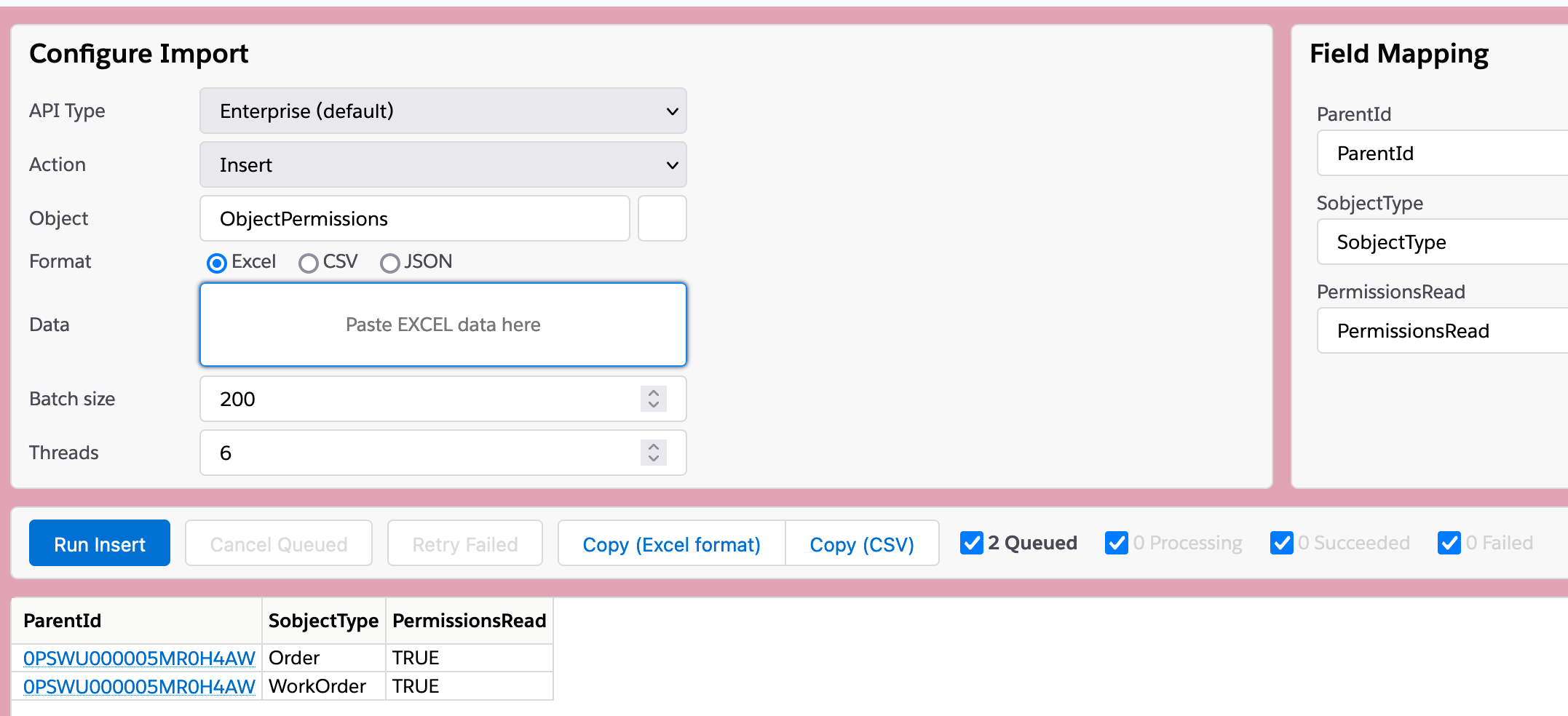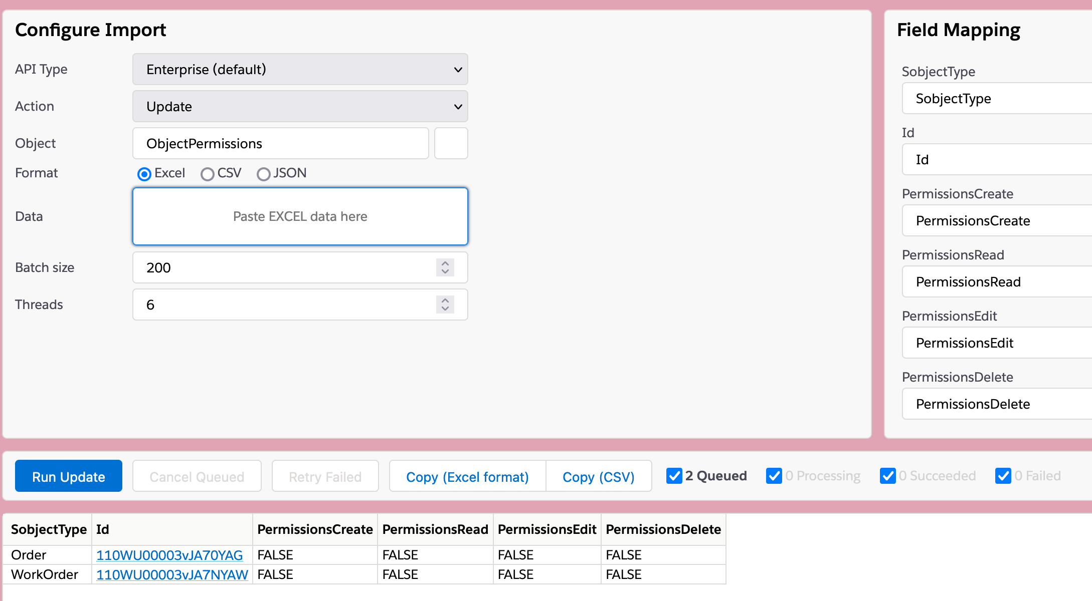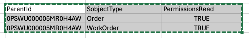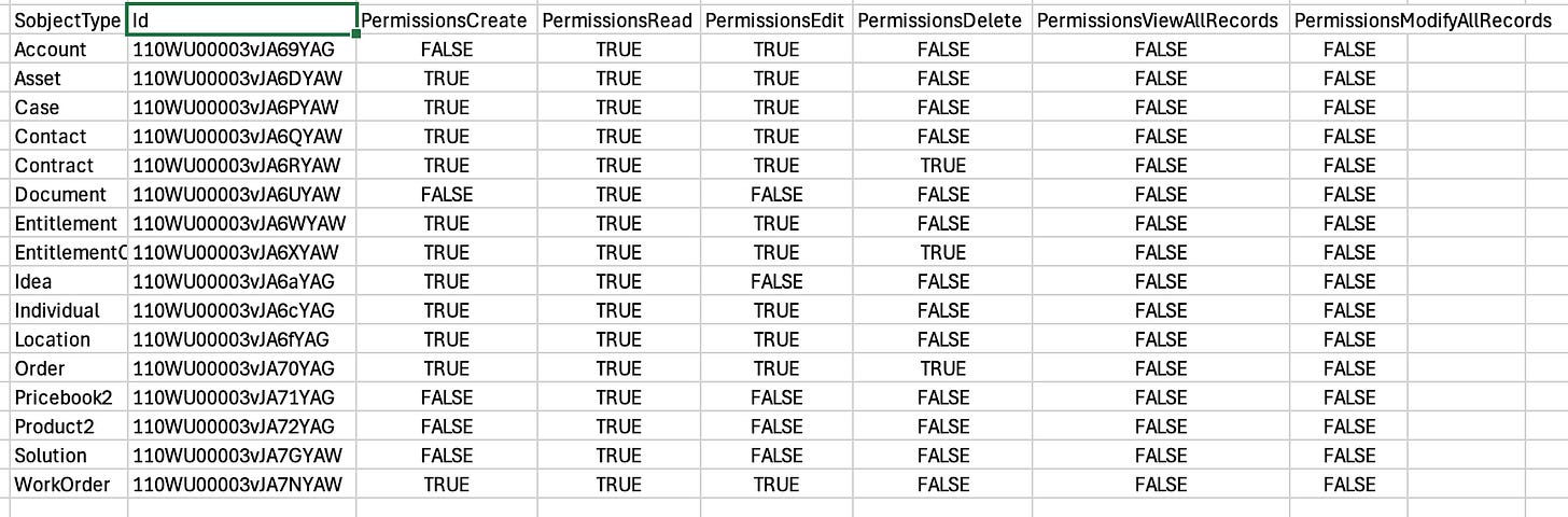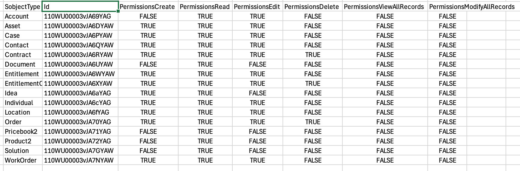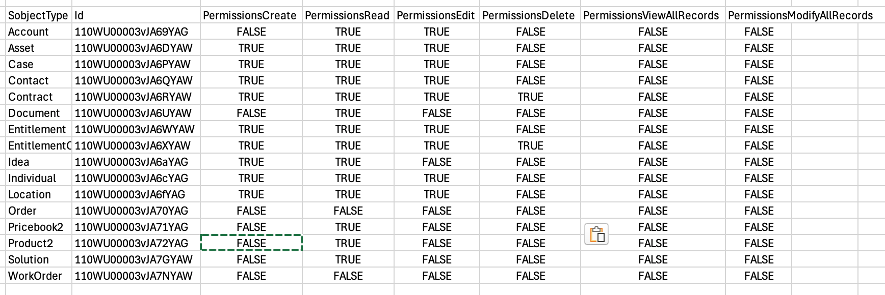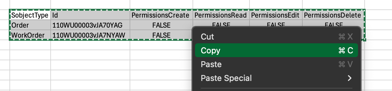 Basically, in this case, we only would need to select the two rows that we have, plus the header row, and we're doing nothing with the View All and Modify All permissions (all are false to begin with), so we can ignore those.