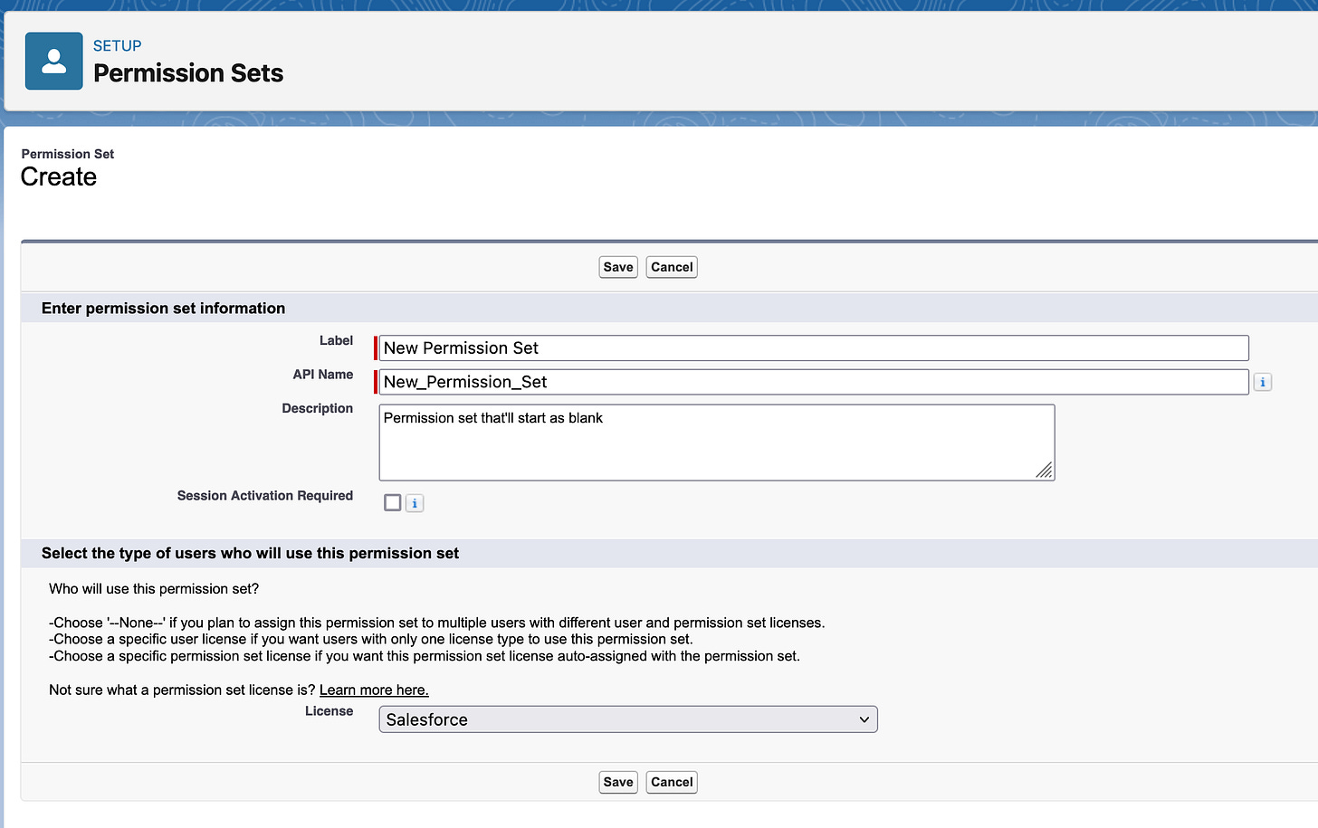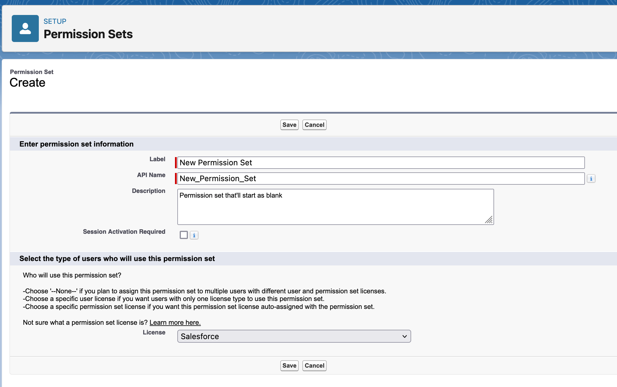 Let's go take a look at some - here I'll create a new, blank permission set without any permissions in it: