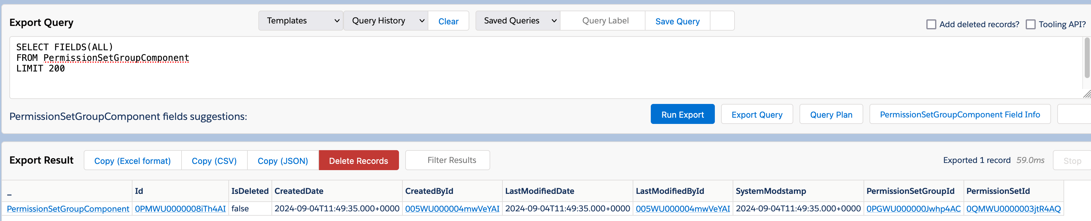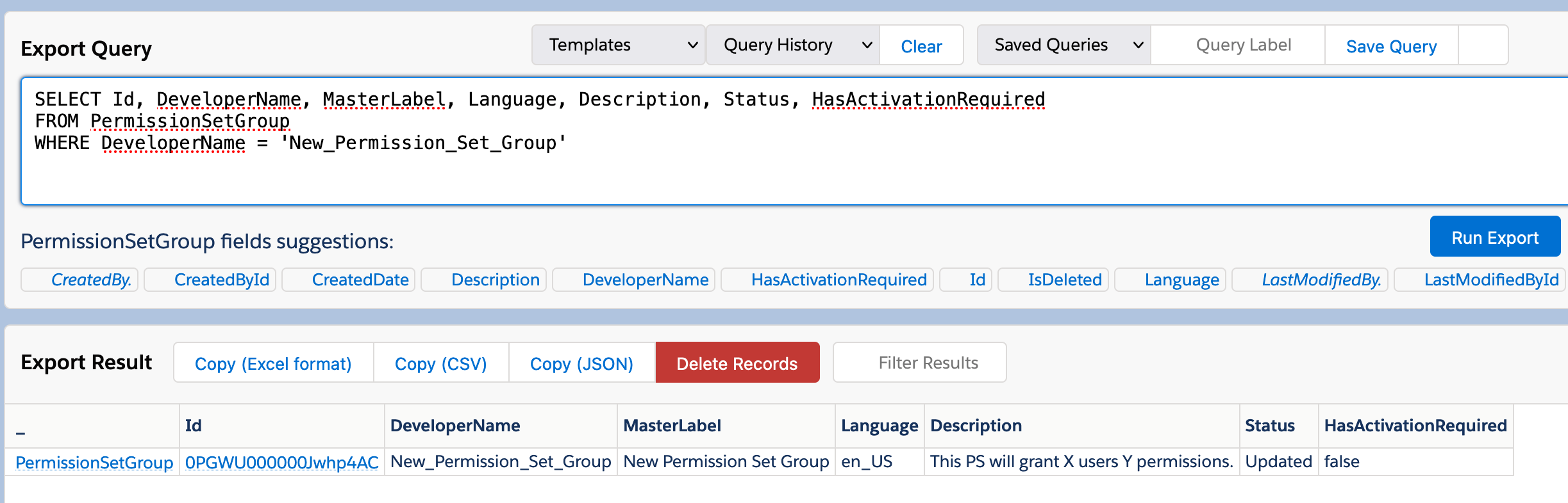 WHERE DeveloperName = 'New_Permission_Set_Group'There's not really much in the way of definable information in the permission set group; if you query the Fields(ALL), you'll get the whole list, it has the usual created dates, created by's and so on, but not much else, really; the XML doesn't give much other information either: