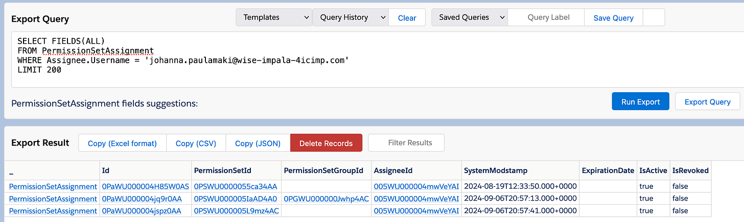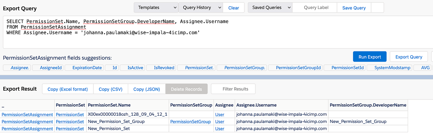 WHERE Assignee.Username = 'johanna.paulamaki@wise-impala-4icimp.com'Here you'll see that while I've created only two entities that I've granted my user the access to, one permission set and one permission set group, there's the third (or first, however you want to look at it), that starts with X00 - that would be the System Administrator Profile's underlying permission set.