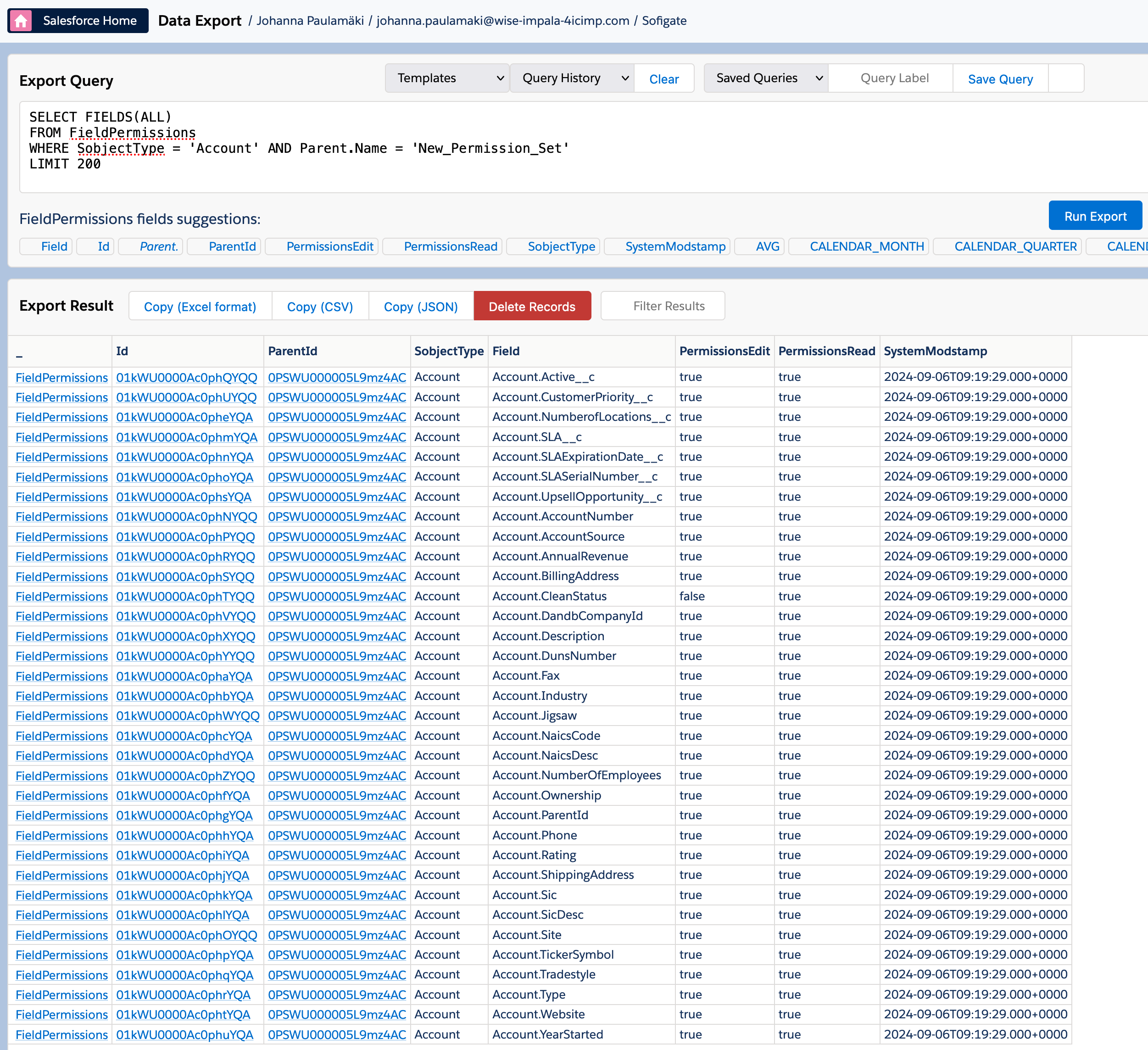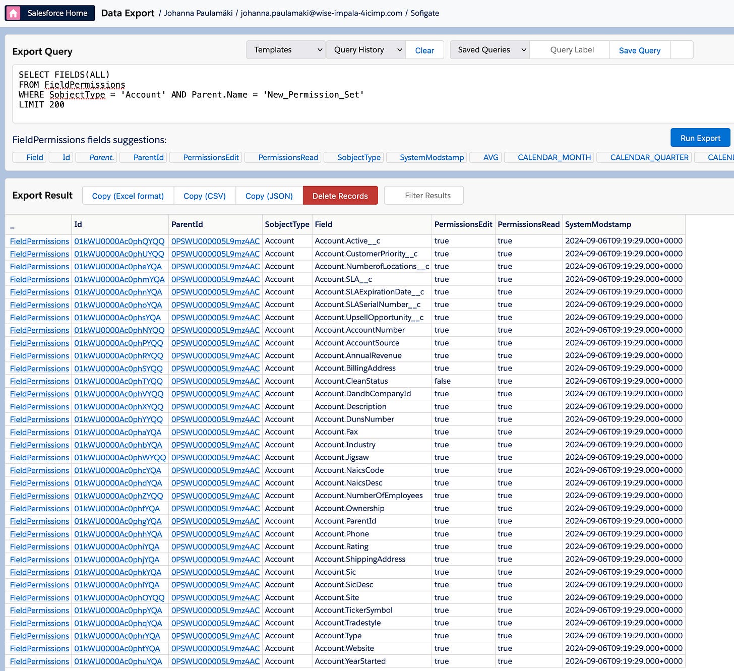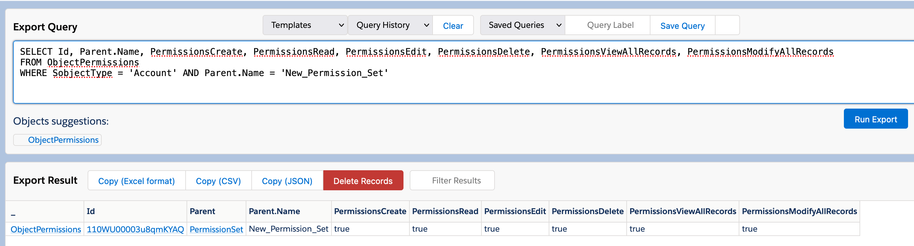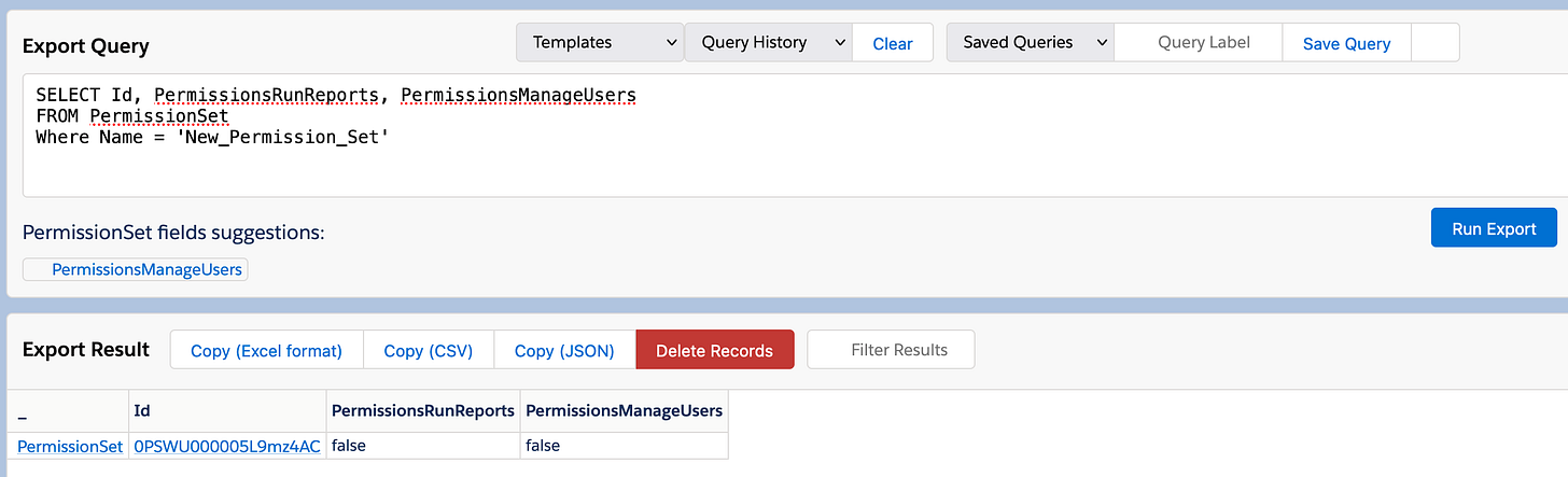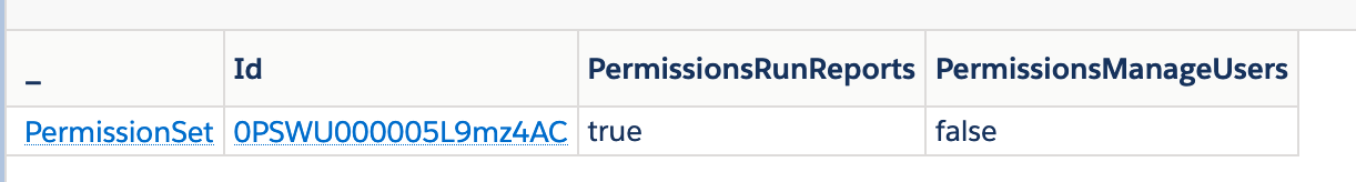 Where Name = 'New_Permission_Set'So, as we can see, querying the permission set gives us - as expected - a false on both of the permissions I queried, because we didn't give it any permissions yet.