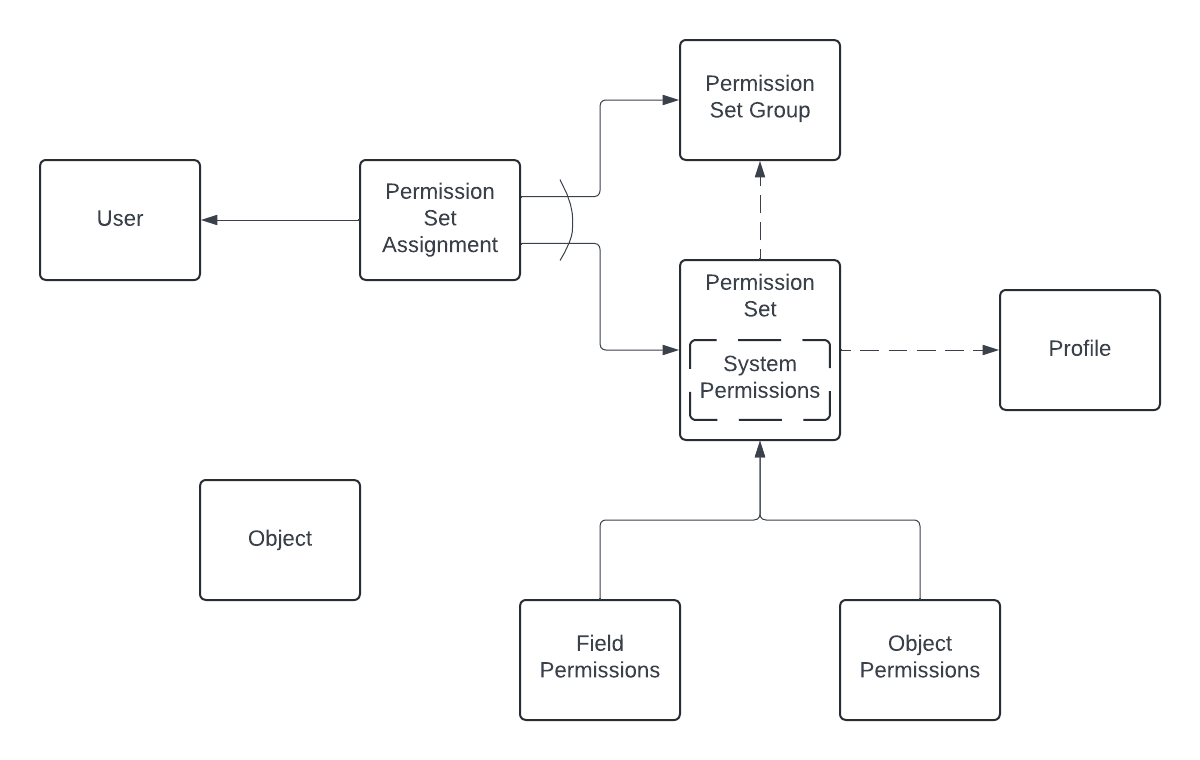 First, there are object permissions and field permissions that define access to objects without a relation to the said object linking up to a permission set, which contains the added system permissions (if any, hence the dashed line on the box) - and then can optionally link up with a profile or a permission set group, hence the dashed arrows - and then permission sets or groups can be assigned to users via permission set assignment.